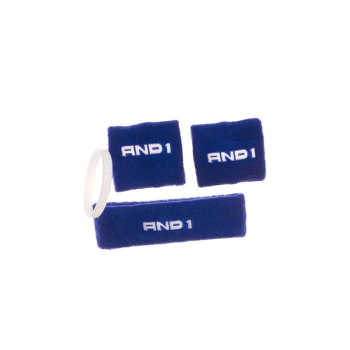 Lot d'un bandeau, 2 poignets et un bracelet de la marque And1. Coloris bleu. Inscription "Team And1" sur le bracelet